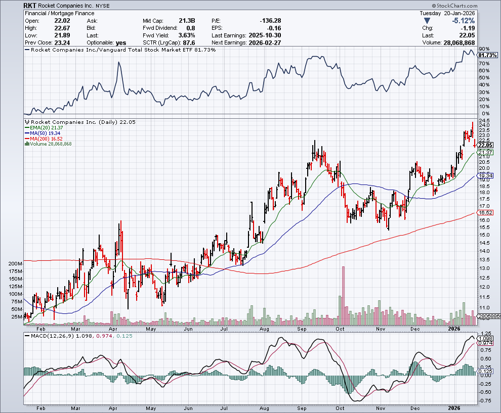 Just 3 weeks into the new year the housing market has shifted from cautious optimism to active policy-driven momentum. After an impressive 2025, my top Financial pick for 2026 RKT has roared out of the gate up 13.89% even after today’s broad based decline in equities. We are seeing increasing investor attention to a number of tailwinds.